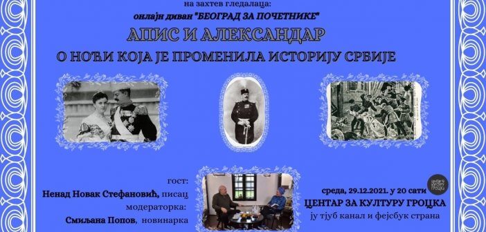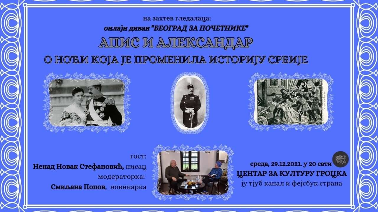 Будите са нама у среду, 29.12.2021. у 20ч, YouTube канал и ФБ страна Центар за културу Гроцка: онлајн-диван „Београд за почетнике” у епизоди: АПИС И АЛЕKСАНДАР –