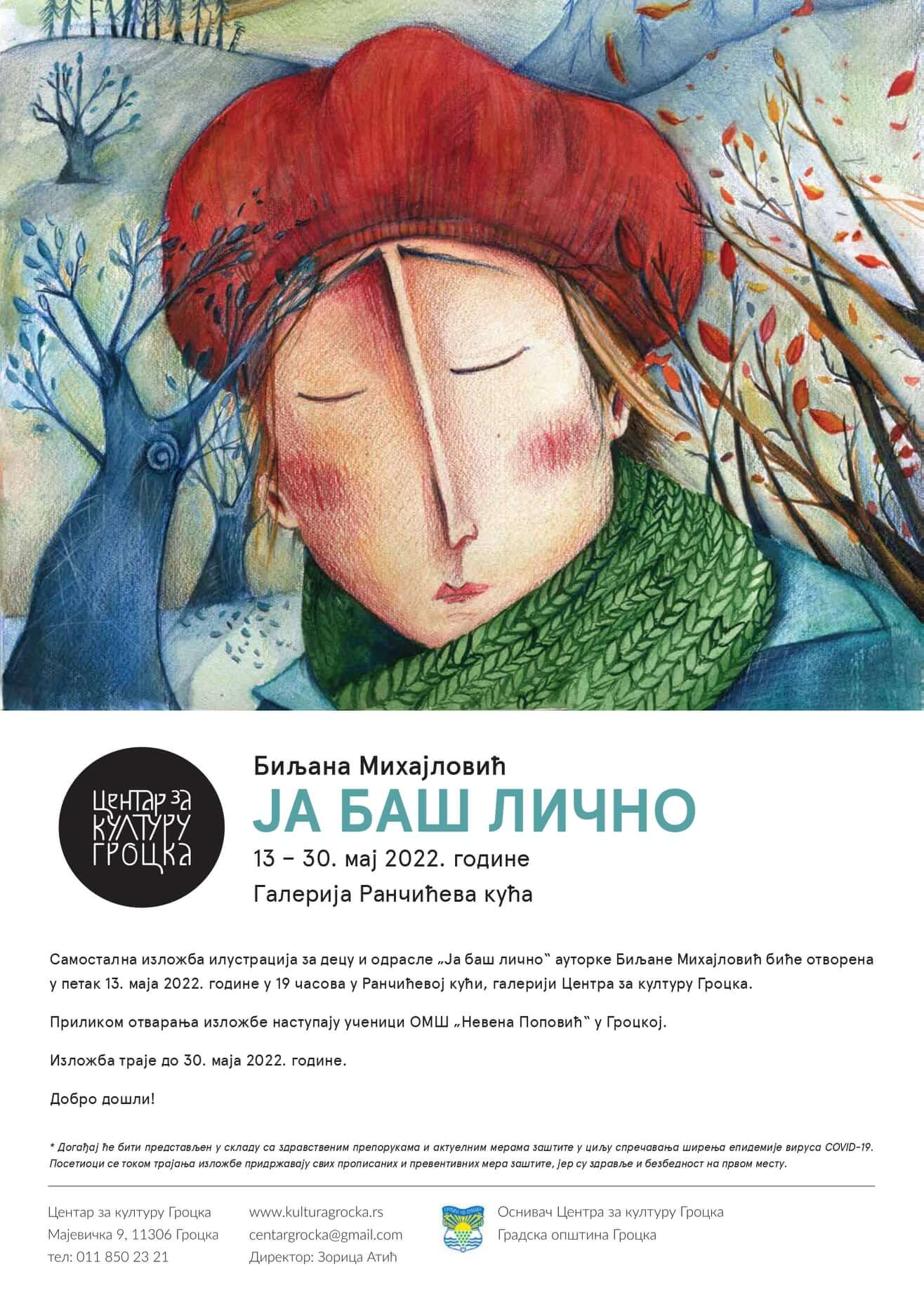 Самостална изложба илустрација за децу и одрасле „Ја баш лично“ ауторке Биљане Михајловић биће отворена у петак 13. маја 2022. године у 19 часова у Ранчићевој кући, галерији Центра за културу Гроцка.