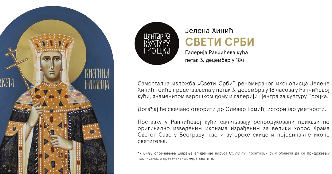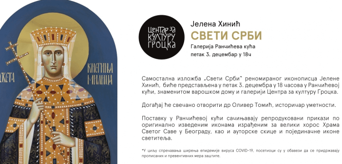 Самостална изложба „Свети Срби“ реномираног иконописца Јелене Хинић, биће представљена у петак 3. децембра у 18 часова у Ранчићевој кући, знаменитом варошком дому и галерији Центра за културу Гроцка.