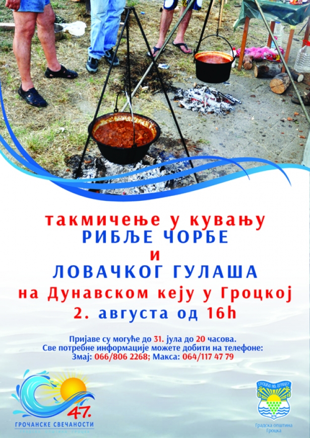 Такмичење у кувању рибље чорбе и ловачког гулаша одржаће се на Дунавском кеју у Гроцкој 2. августа 2014. године од 16 часова. Можете се пријавити до 31. јула 2014. године до 20 часова. Све потребне информације можете добити на телефоне 066/8062268 Змај и 064/1174779 Макса.