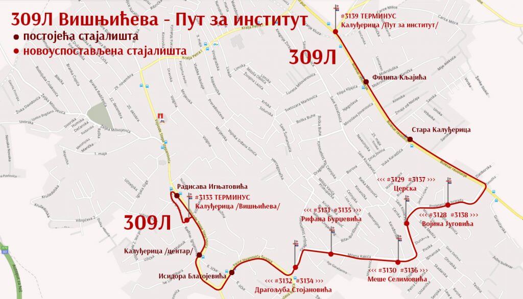 - Калуђерица (Вишњићева) – долазно/полазно стајалиште које се успоставља у улици Вишњићева, на позицији ЕД стуба испред објекта са адресом Радисава Игњатовића 2Г;